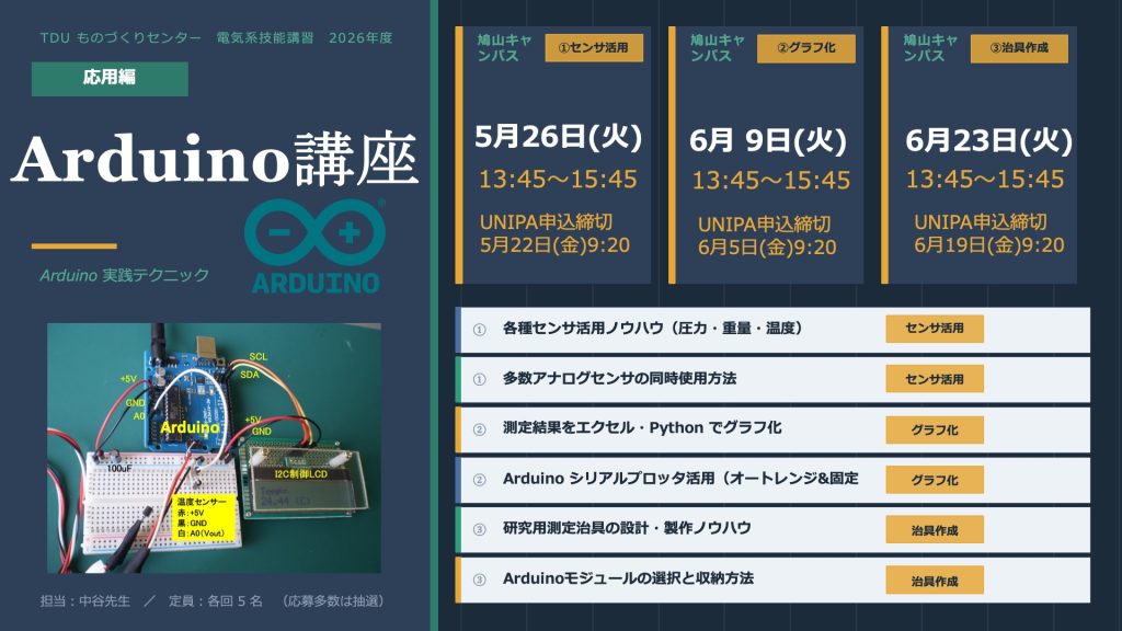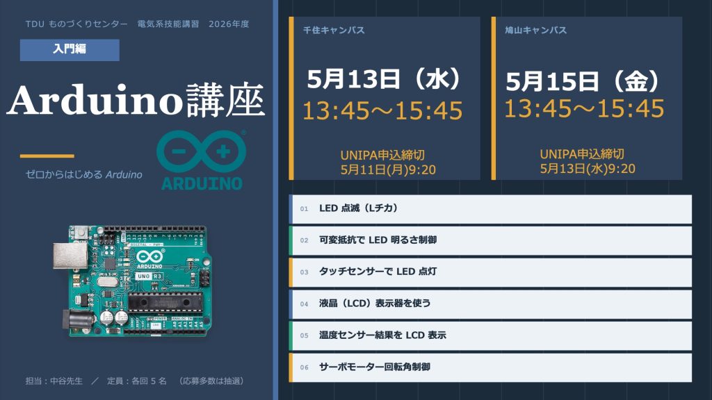 東京電機大学ものづくりセンターでは、電気系技能講習としてArduino講座 入門編・応用編を実施します。