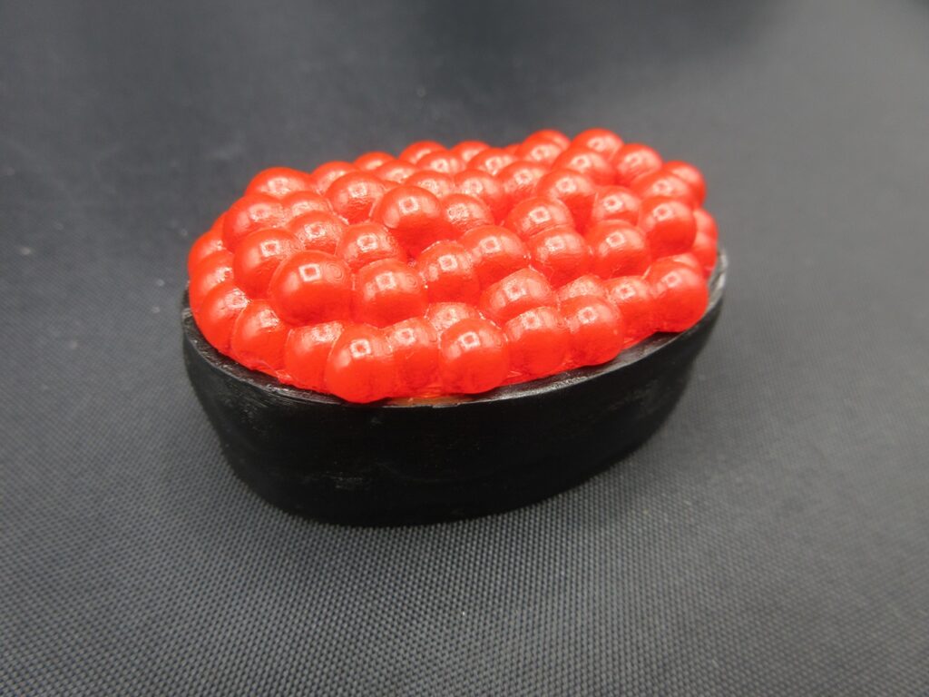 食品サンプルとして寿司の模型を作成し、特にいくらの光沢や質感をリアルに表現するため、試行錯誤を重ねながら制作しました。
