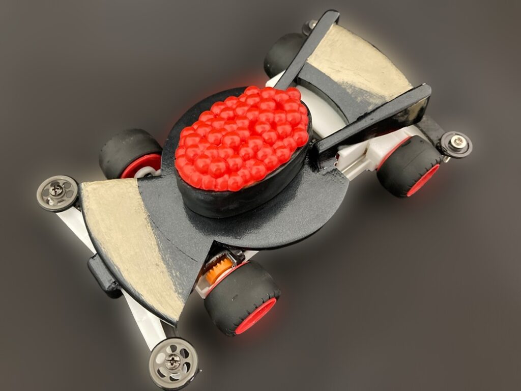 このお寿司の模型は、社会貢献活動の一環として毎年夏に東京千住キャンパスで開催している、小学生ものづくり教室「つくろう体験ミニ四駆(2024)」にて披露しました。ミニ四駆のレーンを回転寿司のレーンに見立てて走行する、ユニークなミニ四駆として披露しました。